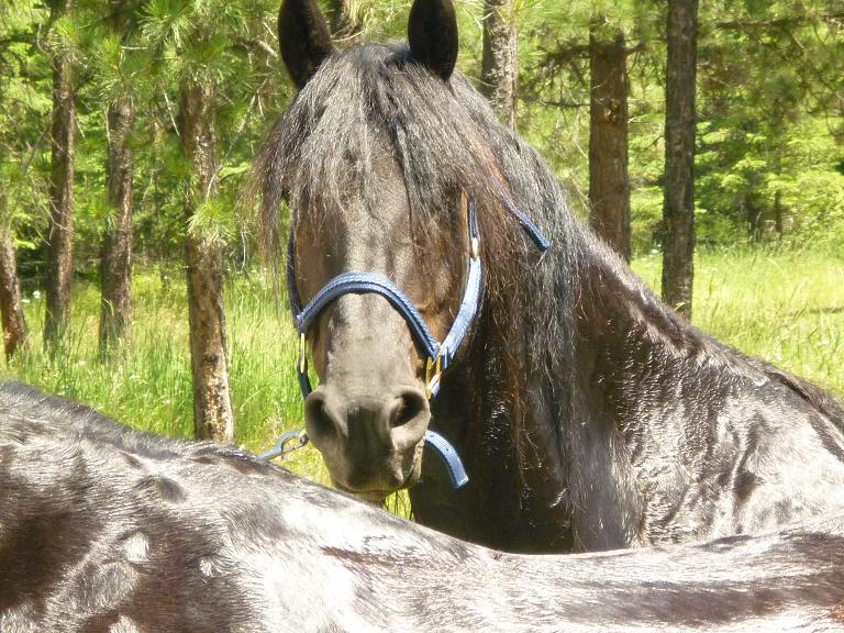 We were graced with three Friesians in our pasture back in July when my friends Teresa Bron and Jacki Cacchiotti (from central Washington) brought them over to present a three-day "driving clinic" to local horse enthusiasts. Two of the horses belonged to Teresa, and one to Jacki.
